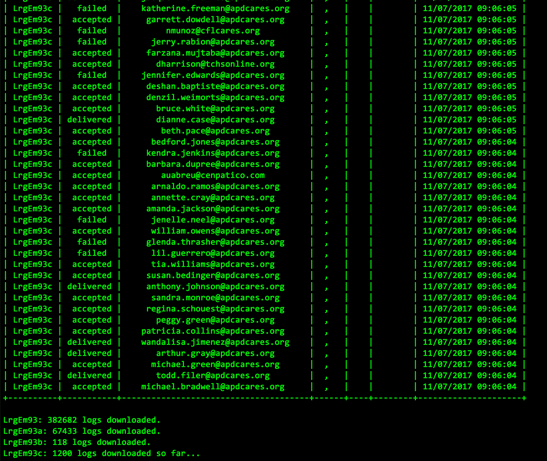 At The Children’s Campaign, we are using a program called Mailgun to send out massive amounts of emails using an API. During the sending process, we assign four separate tags to the emails: LrgEm##, LrgEm##a, LrgEm##b, and LrgEm##c. About a week after we send out these emails through the API, we download all of the 500k logs of events that the email has accumulate (opened, clicked, etc.). Previously we had to consolidate all four tags manually and write excel formulas to do calculations on them, among other steps. It was a sort of tedious process. I thought that we could save time by automating the entire process, so I created this first file (logs.py). It consolidates all of the tags and programmatically adds data into the cells that used to require manual entry of excel formulas. It also uses user entry to name the excel file. All the user has to enter is the tag, type, and date the email was sent out. The program also displays details to the user during runtime.